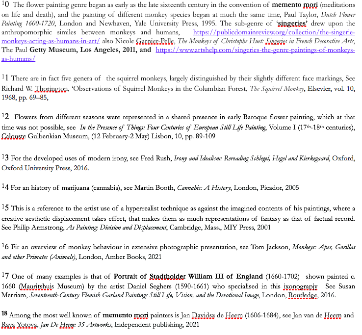 The subject matter nonetheless is also a given synthesis, that is to say a contemporary fusion of distinct genre representations, evoking historical flower painting and the animalier sub-genre that became autonomous categories of European painting in the seventeenth century.10 The Squirrel Monkey is indigenous to the countries of the Amazonas basin in South America, where it lives in the upper canopy of the rainforests. But it is evident in Wilde’s paintings that the floral arrangements, and chosen settings in which the monkeys are presented, have no botanical relationship to the primate’s natural habitat.11 Thus the images are intended to be seen as pure artifice as paintings, though one of a perversely intended presence, since the flowers depicted (largely roses and different blossoming shrub sources) generally share the same botanic or seasonal temporality, which distinguishes them the traditionally intended ‘artificiality’ of the genre of oil-based flower painting.12 In Peter Wilde’s paintings we also experience a hyperrealist reworking of the theatricality of the baroque in the scrupulous use of masterly detail and realistic description on the one hand, and conversely its opposite anti-baroque in the inferred uses of irony and the self-knowing strategy inferred at closer viewer regard.13 A central characteristic of irony is a common synonym of humour and wit, and in a painting called A New Leaf a single cannabis leaf has been added, simply ’painted in’ acknowledging its recent de-criminalisation in Germany.14 Hence there is a certain pictorial elasticity of what is visually experienced between process and scene, the detailed technicalities of the paintings execution, set against the fantastical visual contradictions of the scene settings that are incorporated as subject matter15 In this respect they give further credence to his representations of monkeys as ‘images of mischief’, an iconography and codicil to the ‘monkey business’ as the title to this essay.